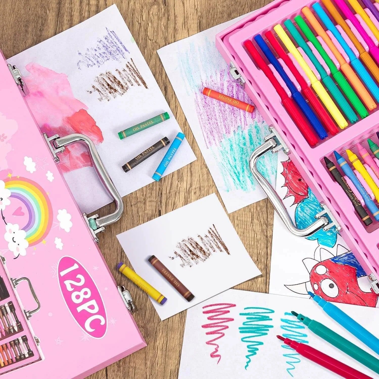 128 Pieces of Artistic Possibility: An extensive collection featuring crayons, colour pencils, markers, and more – everything a young artist needs in one convenient set.